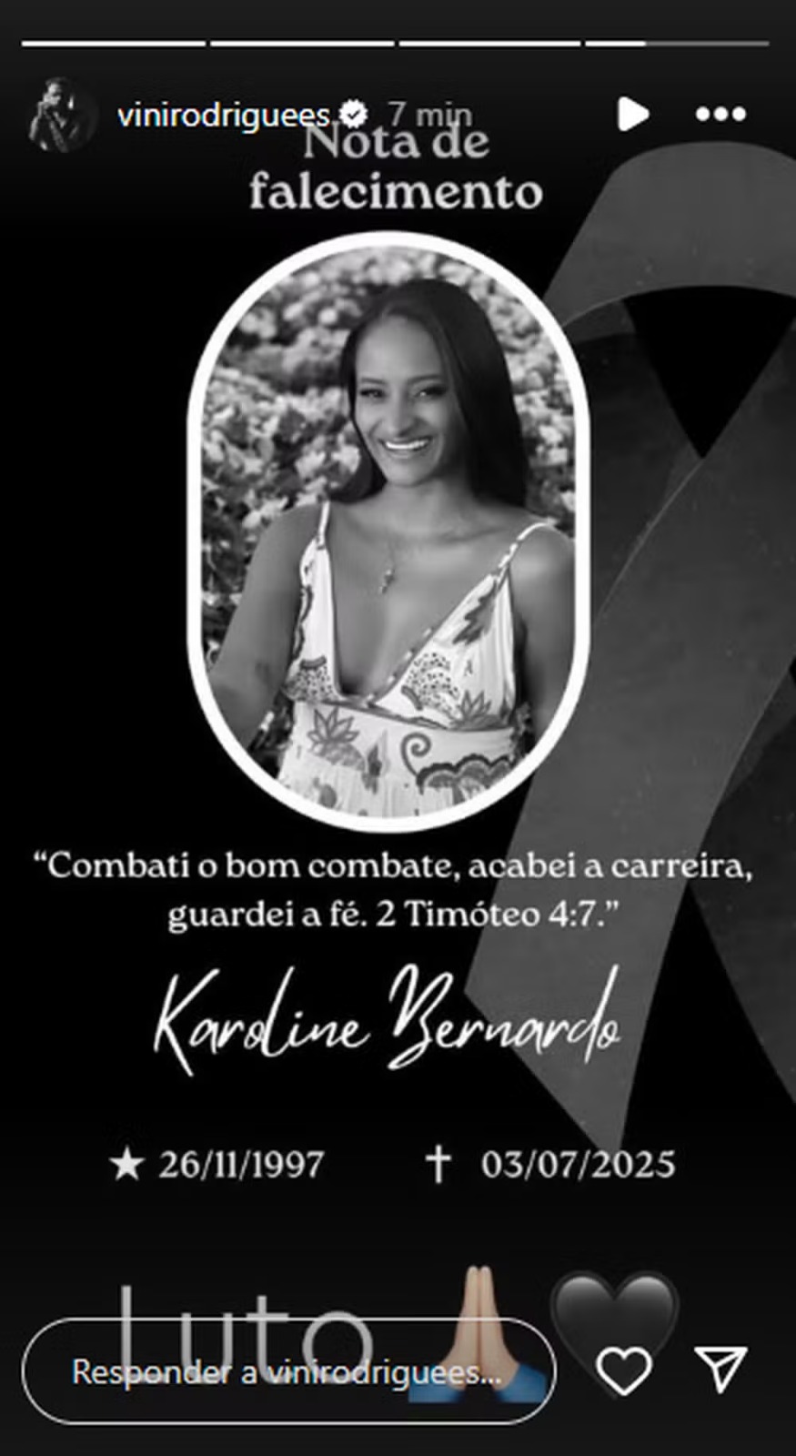 Na publicação, Vinicius compartilhou uma nota de falecimento. “Luto”, escreveu. No dia 11 de junho, Karoline revelou o diagnóstico ao público e desabafou sobre o impacto da notícia.