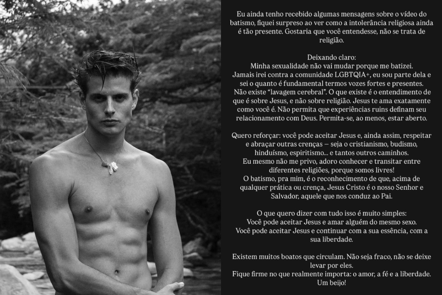 "Eu ainda tenho recebido algumas mensagens sobre o vídeo do batismo, fiquei surpreso ao ver como a intolerância religiosa ainda é tão presente. Gostaria que você entendesse, não se trata de religião. Deixando claro: Minha sexualidade não vai mudar porque me batizei. Jamais irei contra a comunidade LGBTQIA+, eu sou parte dela e sei o quanto é fundamental termos vozes fortes e presentes", disse o ex-BBB.
