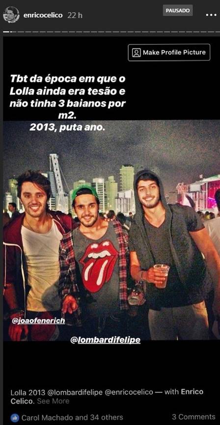 Mais uma polêmica para o currículo de Enrico Celico, ex-cunhado do jogador Kaká. O empresário compartilhou uma foto de 2013 quando curtiu o festival Lollapalooza ao lado de dois amigos e escreveu: "TVT da época em que o Lolla ainda era tesão e não tinha 3 baianos por m². 2013, p*** ano".
