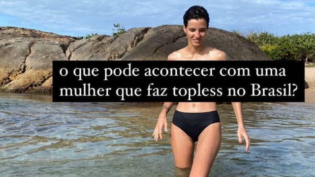 Nos stories anteriores, ela postou uma foto de topless com uma tarja cobrindo os seios com uma legenda que perguntava o que pode acontecer com uma mulher que faz topless no Brasil?