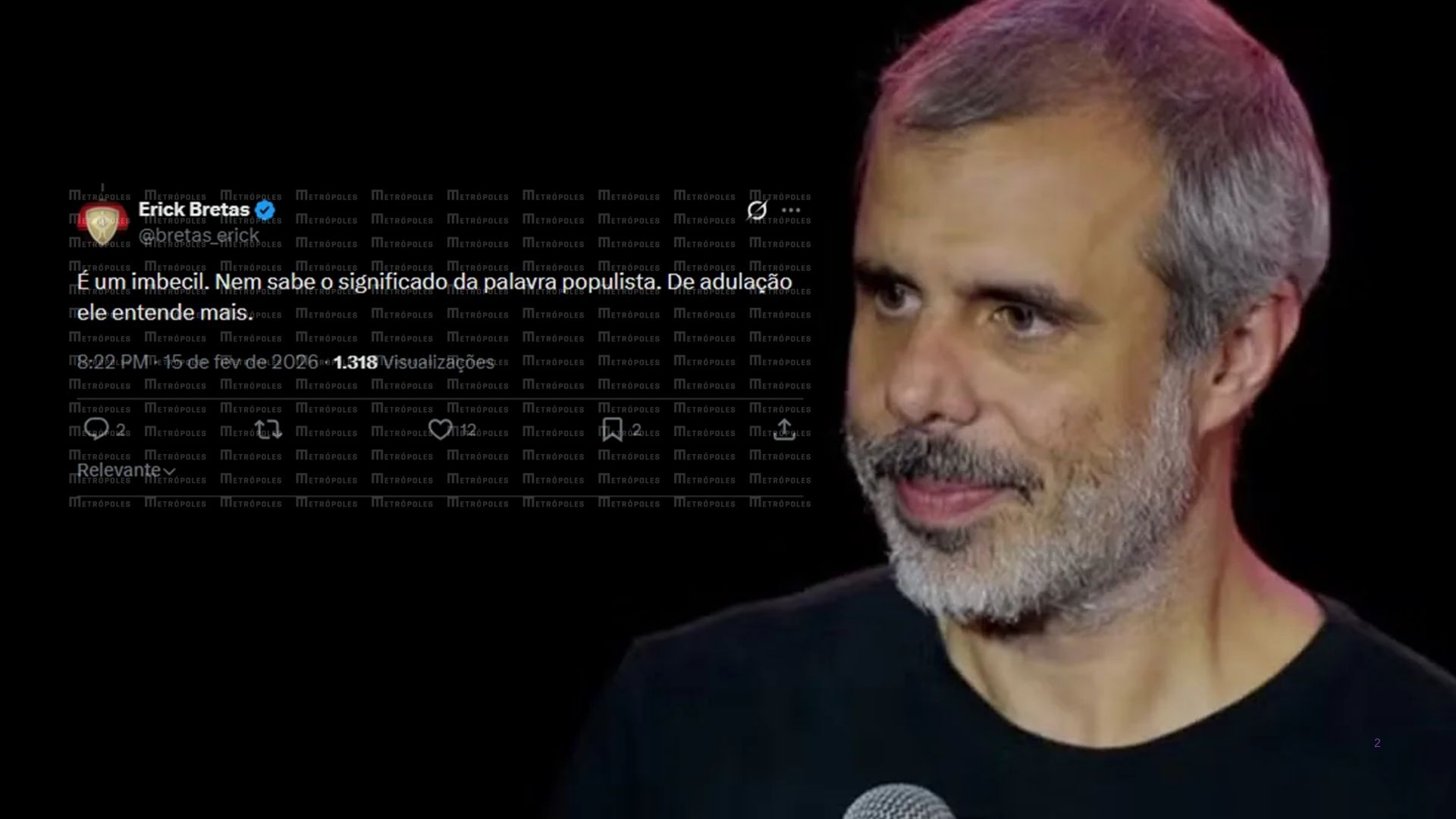 Na mesma postagem, Brêtas ainda ampliou a crítica ao comentar o uso do termo empregado por Bial. “Nem sabe o significado da palavra populista. De adulação ele entende mais”, disparou o jornalista, em mensagem que rapidamente se espalhou pelas redes sociais e gerou debate entre internautas.