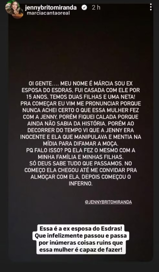 "Oi, gente. Meu nome é Márcia, sou ex-esposa do Esdras. Fui casada com ele por 15 anos, temos duas filhas e uma neta. Para começar, eu vim me pronunciar porque nunca achei certo o que essa mulher fez com a Jenny, porém fiquei calada porque ainda não sabia da história. Porém, ao decorrer do tempo, vi que ela manipulava e mentia na mídia para difamar a moça. Por que falo isso? Porque ela fez o mesmo com a minha família e minhas filhas. Só Deus sabe tudo o que passamos. No começo, ela chegou até a me convidar para almoçar com ela, depois começou o inferno", disse na ocasião.