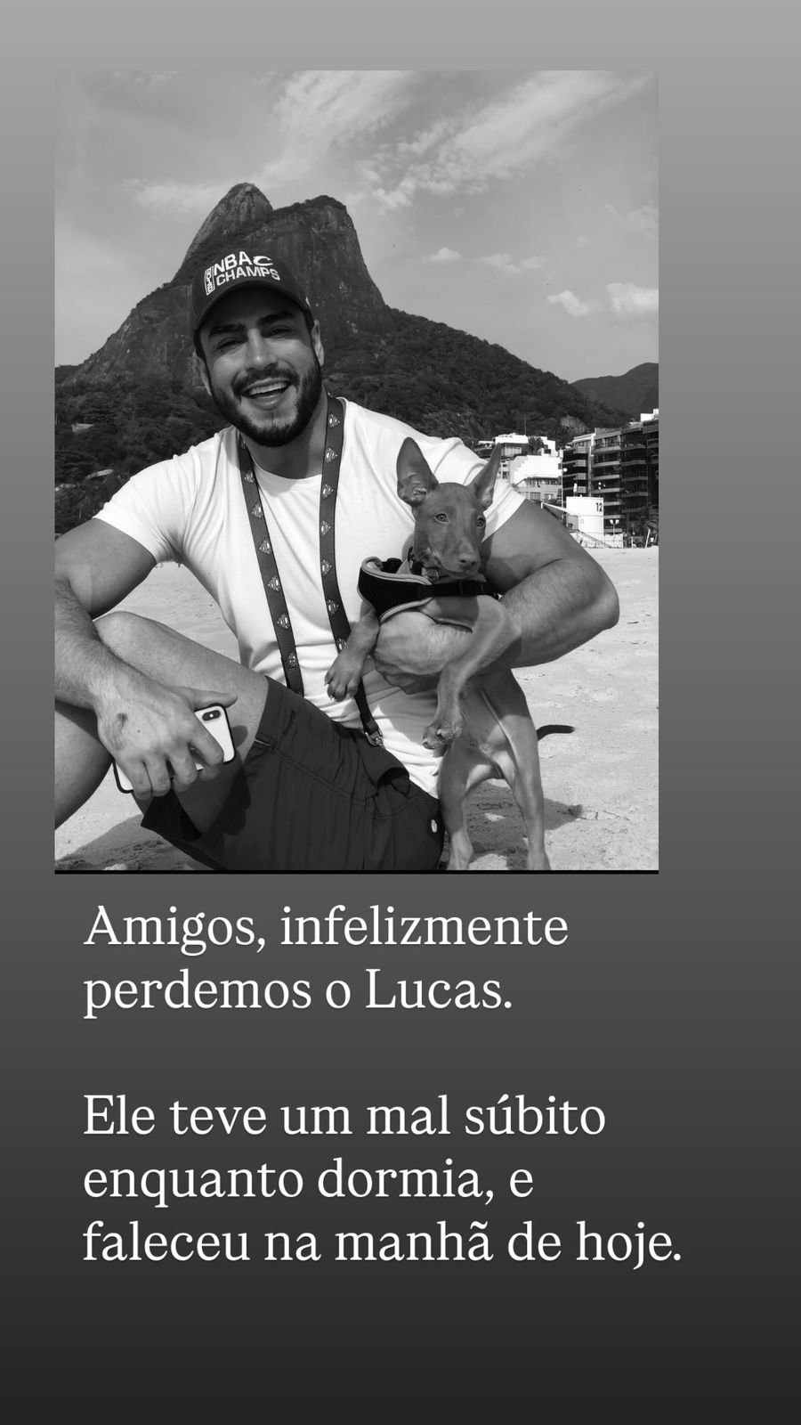 “Amigos, infelizmente perdemos o Lucas. Ele teve um mal súbito enquanto dormia e faleceu hoje de manhã. Vivemos anos incríveis, Lucas emanava amor. Por isso que eu peço que rezem por ele, e amem muito seus próximos. É um momento extremamente difícil e pessoal. Obrigado a todos por entender e respeitar’’, escreveu Correia no Instagram
