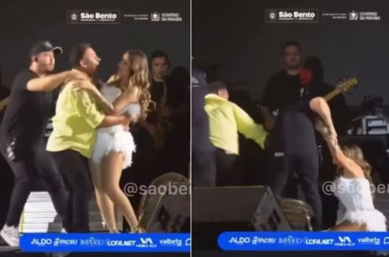 A cantora Walkyria Santos acabou caindo no palco, após ser agarrada e segurada por um fã durante uma apresentação em São Bento, no Sertão da Paraíba. O incidente aconteceu na madrugada deste domingo (13), enquanto a artista conversava com o público.