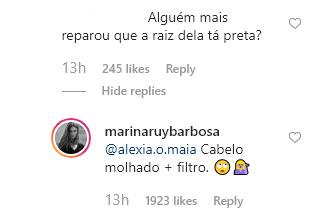 Marina, então, rebateu: "Cabelo molhado + filtro". Vale lembrar que a global é alvo de constantes rumores sobre a verdadeira cor de seus fios. Ela insiste que é ruiva natural, enquanto alguns apontam o contrário.