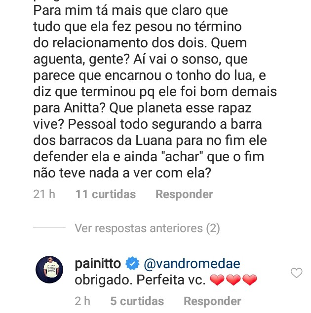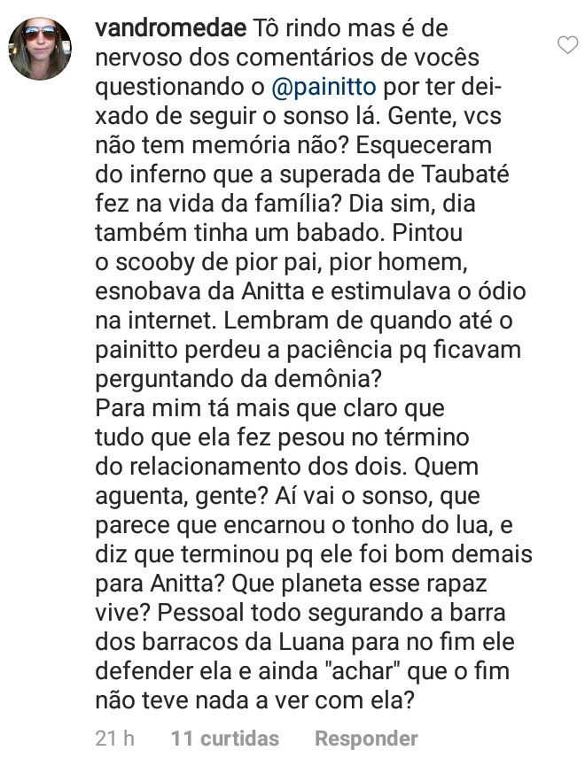 "Tô rindo mas é de nervoso dos comentários de vocês questionando o @painitto por ter deixado de seguir o sonso lá. Gente, vcs não tem memória não? Esqueceram do inferno que a superada de Taubaté fez na vida da família? Dia sim, dia também tinha um babado. Pintou o scooby de pior pai, pior homem, esnobava da Anitta e estimulava o ódio na internet. Lembram de quando até o painitto perdeu a paciência pq ficavam perguntando da demônia? Para mim tá mais que claro que tudo que ela fez pesou no término do relacionamento dos dois. Quem aguenta, gente? Aí vai o sonso, que parece que encarnou o tonho do lua, e diz que terminou pq ele foi bom demais para Anitta? Que planeta esse rapaz vive? Pessoal todo segurando a barra dos barracos da Luana para no fim ele defender ela e ainda "achar" que o fim não teve nada a ver com ela?", escreveu a moça.