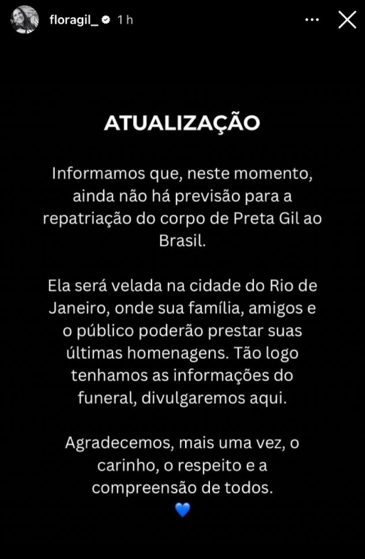 “Informamos que, neste momento, ainda não há previsão para a repatriação do corpo de Preta Gil ao Brasil. Ela será velada na cidade do Rio de Janeiro, onde sua família, amigos e o público poderão prestar suas últimas homenagens. Tão logo tenhamos as informações do funeral, divulgaremos aqui. Agradecemos, mais uma vez, o carinho, o respeito e a compreensão de todos”, diz o comunicado da família.