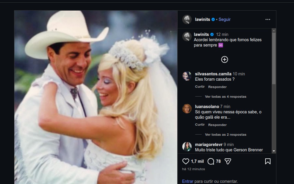 Daniele Winits, atriz, que fez par romântico com Brenner na última novela que ele gravou, publicou no Instagram: “Acordei lembrando que fomos felizes para sempre.”