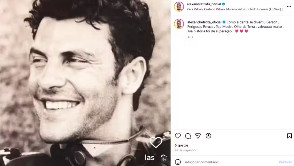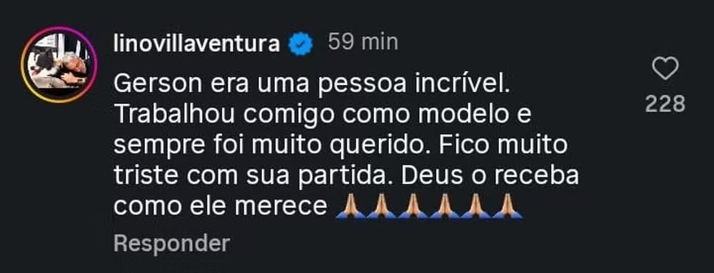“Gerson era uma pessoa incrível. Trabalhou comigo como modelo e sempre foi muito querido. Fico muito triste com sua partida. Deus o receba como ele merece.”