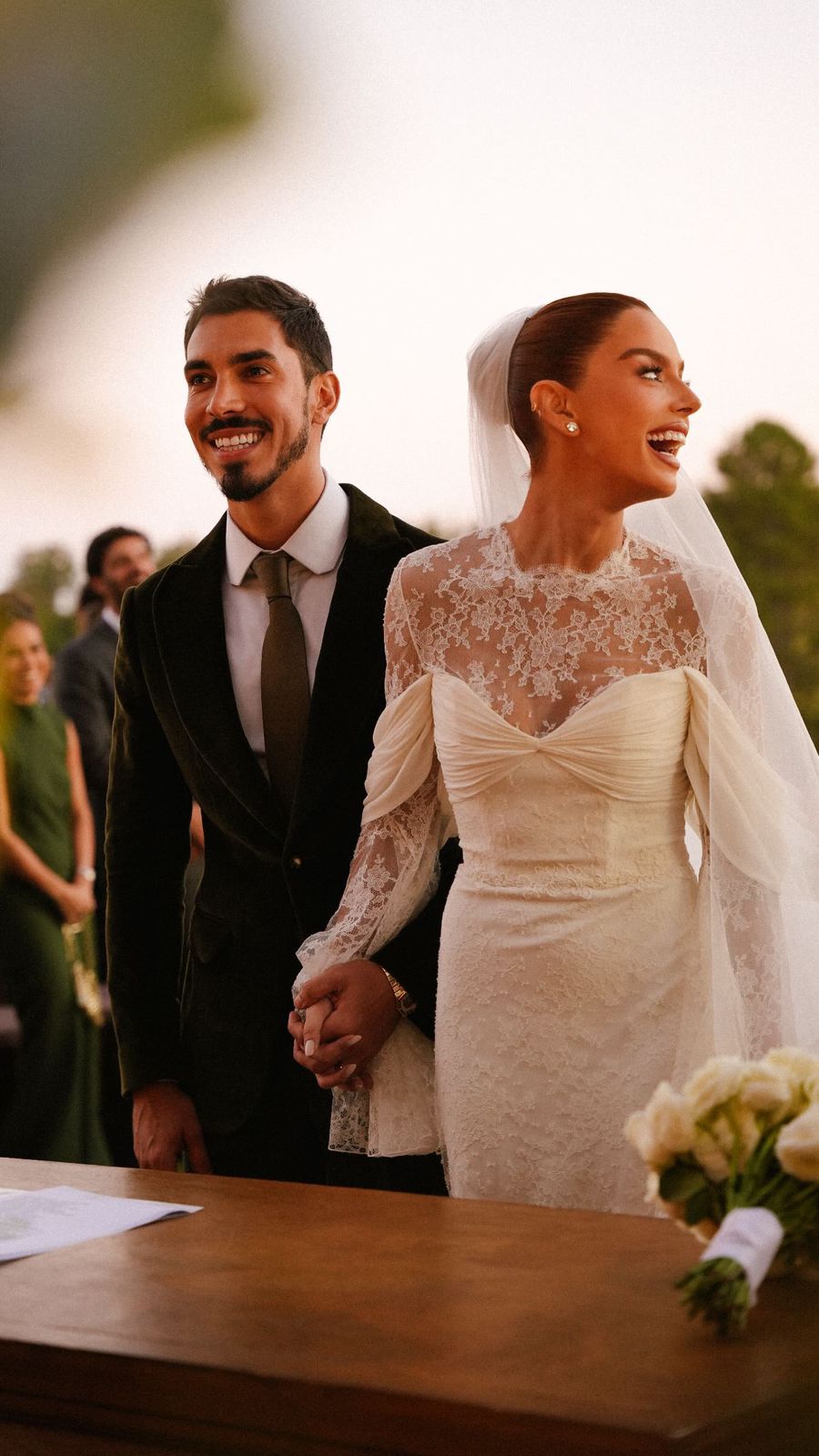 A noiva escolheu um vestido do estilista francês Giambattista Valli. “O vestido de noiva foio uma escolha muito especial, mas quando vi o croqui, me emocionei. Ele é feito com renda francesa, tem uma textura maravilhosa. Ele tem duas peças, sendo a parte de cima é um bolero com manga sinoi. Mas o que me arrebatou foi o véu. Ele tem um babado em volta de toda a borda, que dá um ar mais dramático, mais lúdico. É o vestido da minha vida”, completou Lancellotti,