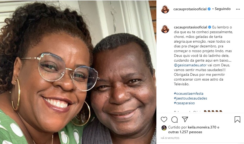 Cacau Protásio, atriz: "Eu lembro o dia que eu te conheci pessoalmente, chorei, mãos geladas de tanta alegria,que emoção, rezei todos os dias pra chegar dezembro, pra começar o nosso projeto lindo, mas Deus quis você lá do ladinho dele, cuidando da gente aqui em baixo..., @gesioamadeu.ator vai com Deus, vamos sentir muitas saudades!!! Obrigada Deus por me permitir contracenar com esse astro da Televisão."