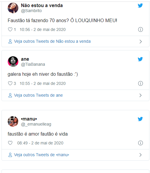 O apresentador Fausto Silva, que comanda o Domingão do Faustão há décadas na TV Globo, completa 70 anos hoje. No Twitter, ele recebeu uma série de homenagens de fãs ao redor do Brasil já no início desta manhã.Informações do Uol