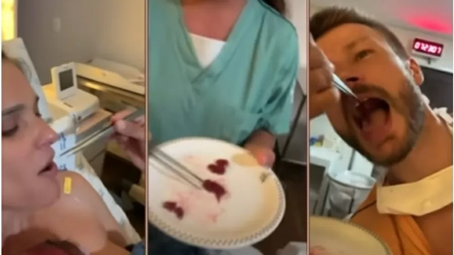 As imagens foram exibidas no programa "Bem Juntinhos", no GNT, comandado pelo casal. No vídeo, a profissional de saúde entrega a placenta para eles comerem e brinca, dizendo que é "para chocar a sociedade", no que a apresentadora ironiza: "Pausa e drama".