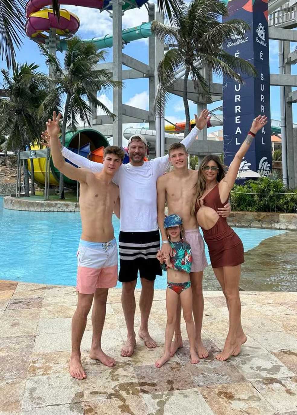 Fernanda Lima e Rodrigo Hilbert se divertiram em um parque aquático com os gêmeos, João e Francisco, de 17 anos, e a caçula Maria Manoela, de 6. Um detalhe que chamou atenção foi a altura dos adolescentes, que estão com 1,80 m.
