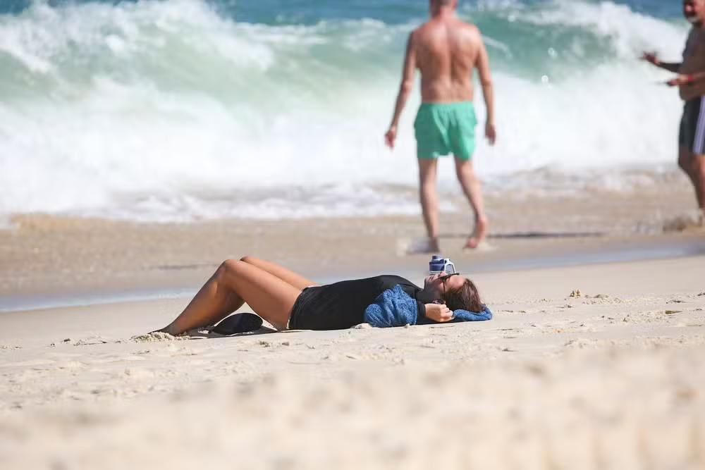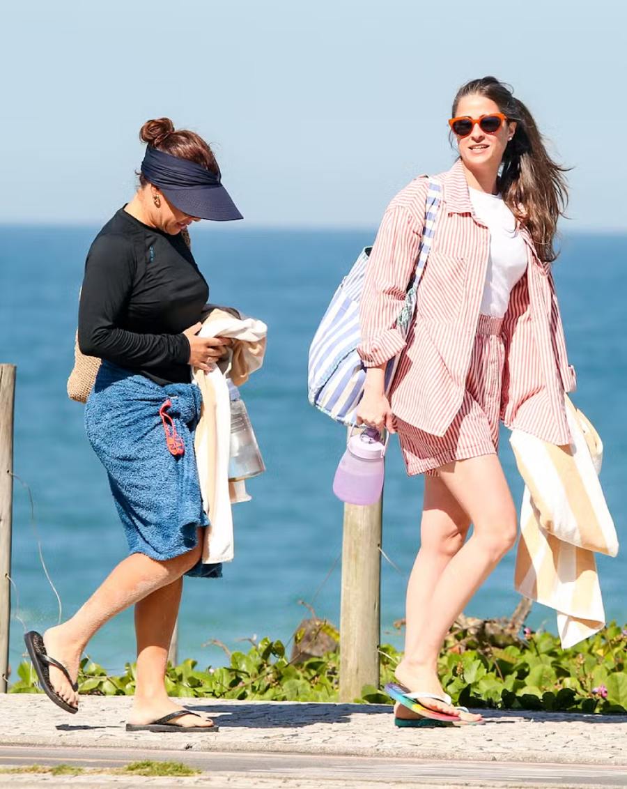 Com óculos escuros e cabelos presos, ela usava uma blusa de proteção UV de mangas longas, por cima do biquíni. Já Eduarda vestia short e camisão listrados de branco e rosa, com camiseta por baixo. Durante o momento de lazer, a atriz relaxou deitada na areia.