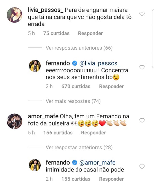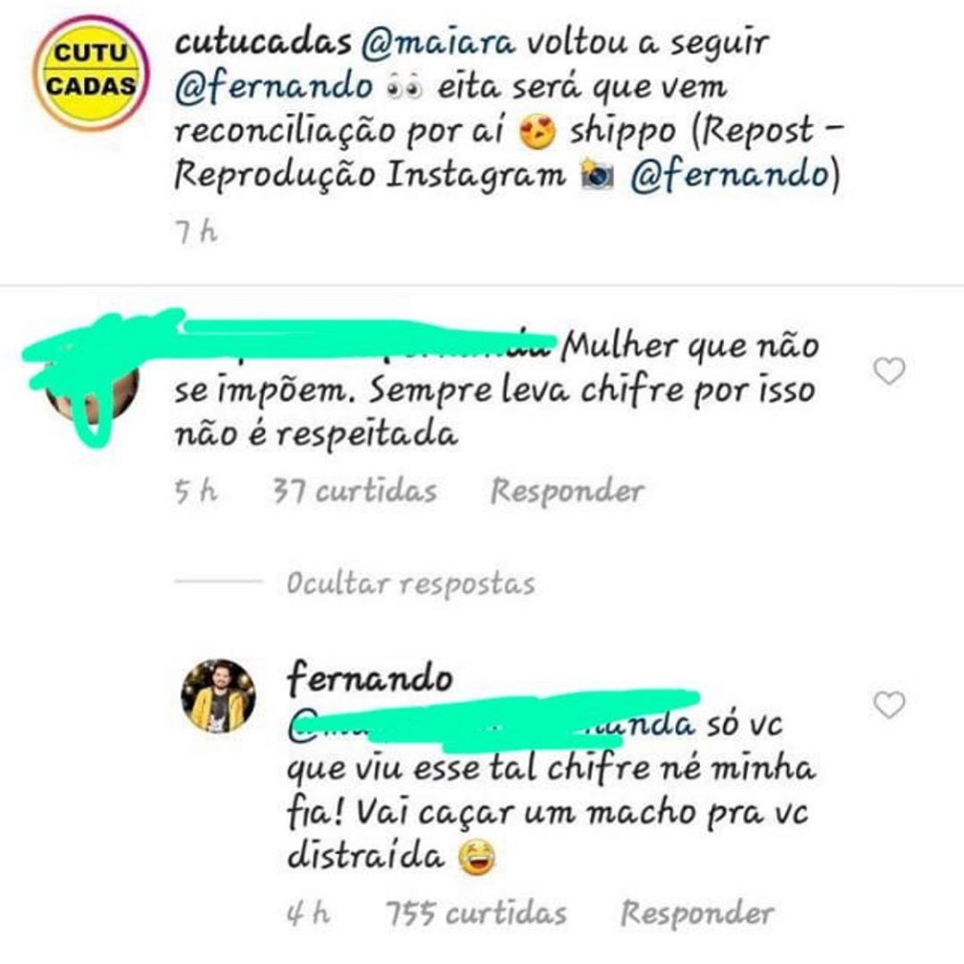 Quando um seguidor pediu para que ele parasse de enganar a cantora, que ele não a amava, o sertanejo respondeu: "Errou! Concentra nos seus sentimentos, bebê!". Já outro seguidor disse que insinuou que a Maiara levava chifre porque não se impunha. "Só você viu esse tal chifre, né minha filha! Vai caçar macho para você dar uma distraída", respondeu ele.