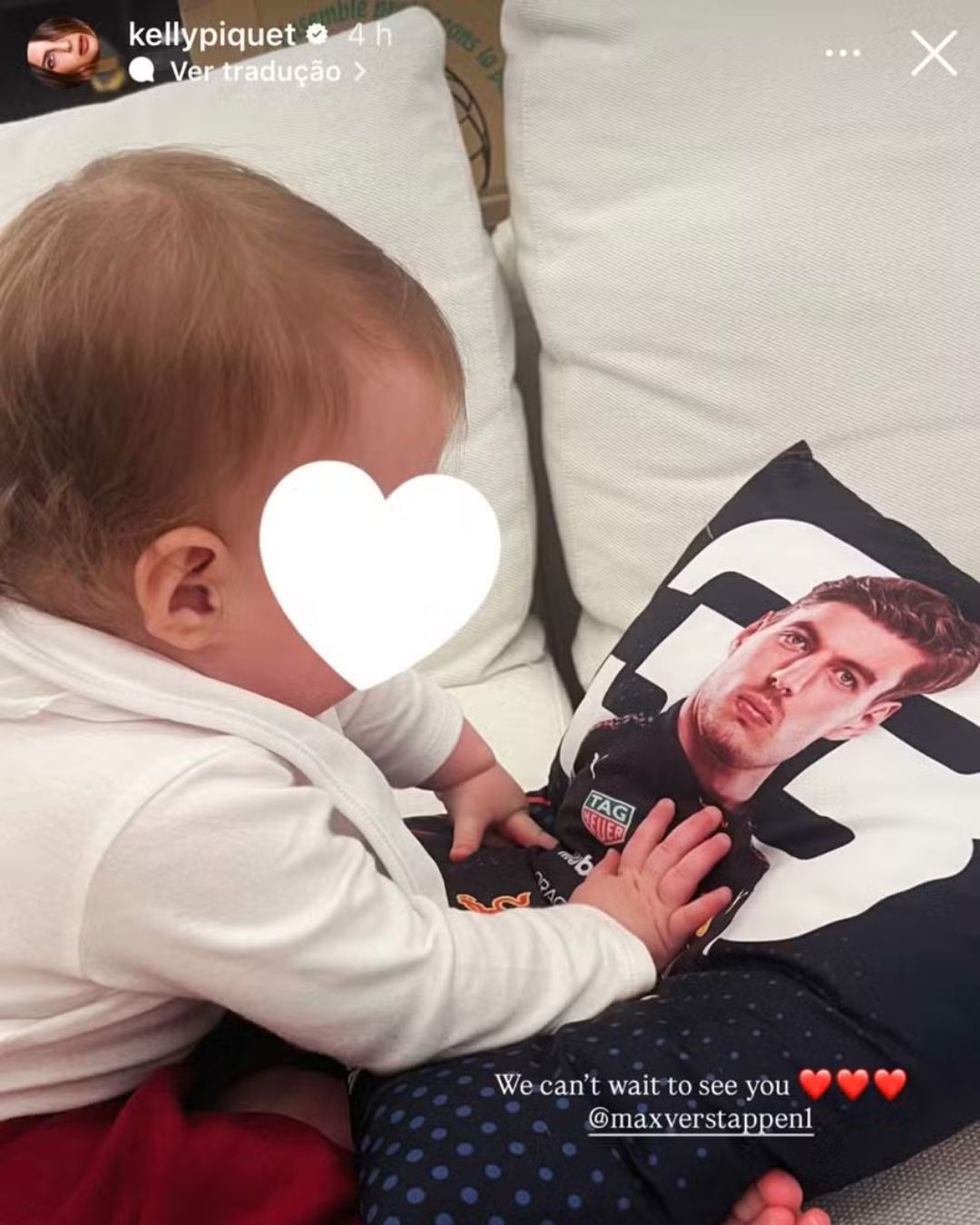 A modelo Kelly Piquet compartilhou, neste domingo (15), nas redes sociais, um registro da filha caçula, Lily, admirando uma foto do pai, o piloto Max Verstappen. A bebê de oito meses aparece com a mão sobre a imagem, em um momento íntimo publicado pela mãe. O rosto da criança foi preservado com um emoji de coração branco.