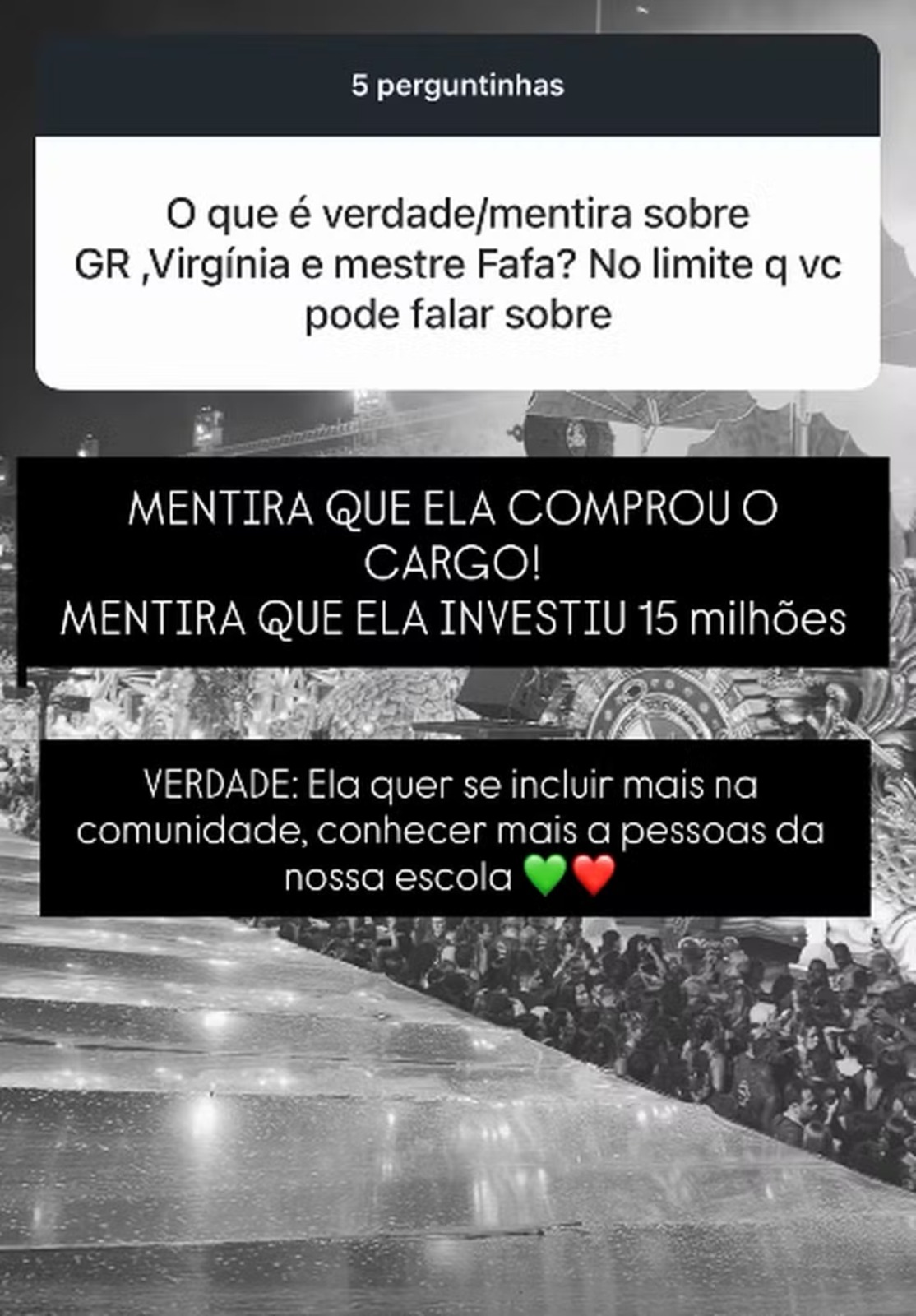 Ao abrir uma caixa de perguntas no Instagram, Thainá foi questionada sobre especulações de que Virginia teria comprado o posto ou investido R$ 15 milhões na escola.