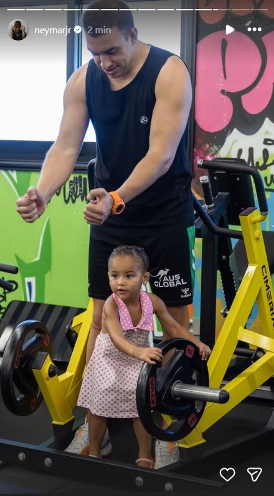 As filhas do jogador Neymar, Mavie, de 2 anos, e Mel, de 8 meses, chamaram atenção em registros feitos durante um treino realizado pelo atleta nesse domingo (29). As imagens foram compartilhadas nas redes sociais e mostram as crianças acompanhando o pai na academia.