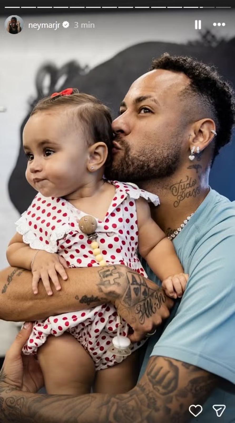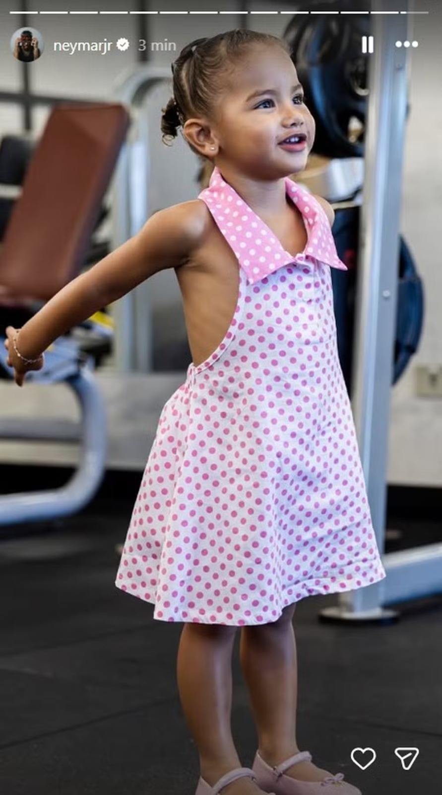 Mavie, primogênita do relacionamento com a influenciadora Bruna Biancardi, aparece usando um vestido rosa de poá enquanto interage com um peso. Já a caçula, Mel, surge no colo do jogador, que beija a filha na bochecha.