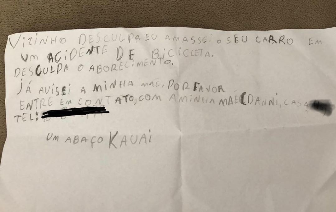 "Foi muito difícil não chorar quando vi o bilhetinho que kauai deixou na portaria para o vizinho. Ele me contou que caiu de bicicleta, mas não me falou do amassado no carro, mas estou muito feliz de ver que ele assumiu a responsabilidade e foi honesto dando o jeitinho dele de resolver as coisas", contou.