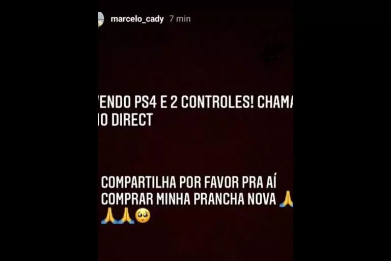 “Vendo PS4 e dois controles! Chama no direct. Compartilha por favor, para aí comprar minha prancha nova”, disse ele na rede social.