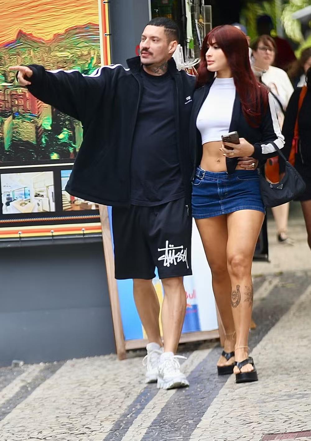 O rapper vestia bermuda e casaco pretos. A influenciadora, por sua vez, apostou em um look despojado e curto, com minishort, moletom, cropped e salto plataforma.