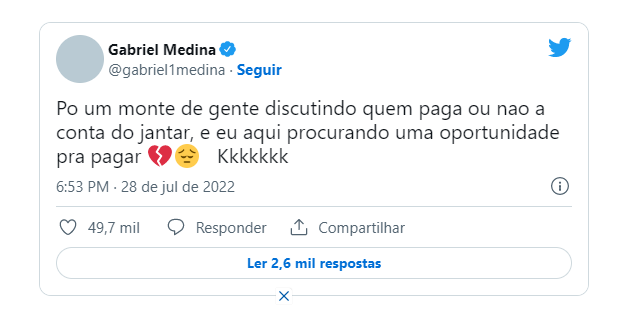 Gabriel Medina diz estar “procurando uma oportunidade para pagar” um jantar |