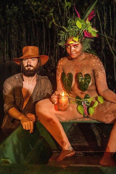 Gaby Amarantos saiu do Pará (atualmente ela vive no Rio), mas nunca abandonou suas raízes. A cantora acaba de lançar dois clipes simultaneamente e posou com o marido, o inglês Gareth Jones, nos bastidores. No clique, Gaby aparece seminua, com o corpo pintado, coberto apenas por folhas. As informações são do Extra.