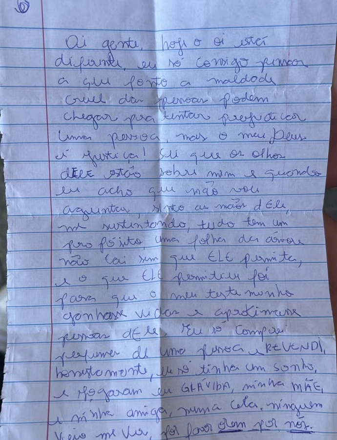 "Oi, gente, hoje o 'oi' está diferente, eu só consigo pensar a que ponto a maldade cruel das pessoas pode chegar pra tentar prejudicar uma pessoa, mas o meu Deus é justiça! Sei que os olhos Dele estão sobre mim e, quando eu acho que não vou aguentar, sinto as mãos d’Ele me sustentando. Tudo tem um propósito, uma folha da árvore não cai sem que Ele permita, e o que Ele permitiu foi pra que o meu testemunho ganhasse vidas e aproximasse pessoas d’Ele. Eu só comprei perfumes de uma pessoa e REVENDI, honestamente. Eu só tinha um sonho e jogaram eu GRÁVIDA, minha mãe e minha amiga numa cela. Ninguém veio me ver. Por favor, orem por nós."