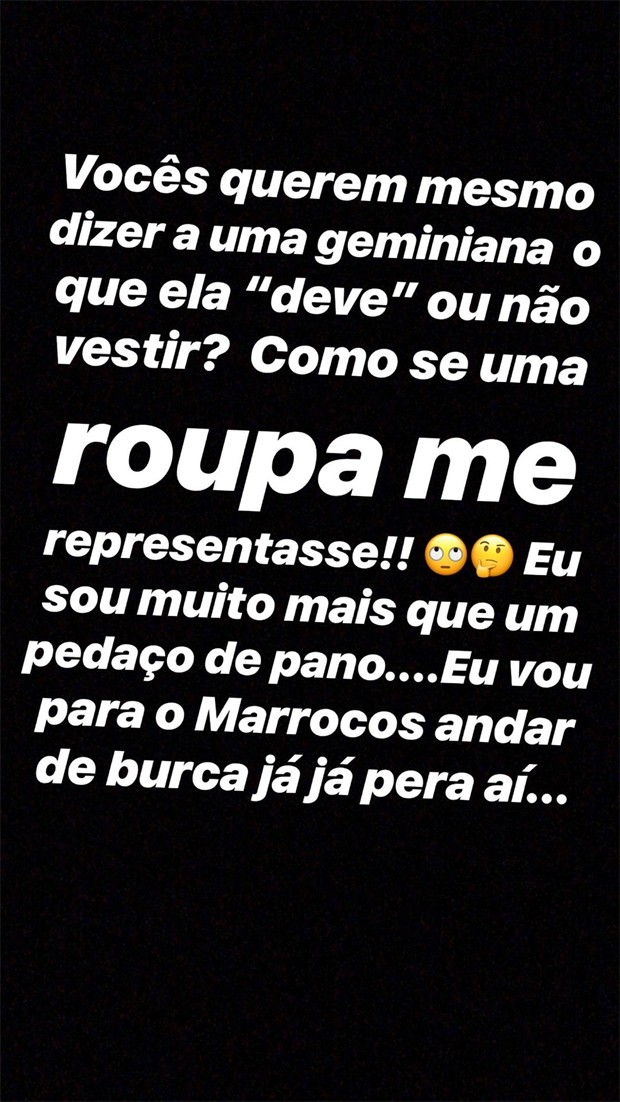 A modelo ainda frisou que tem muitos estilos e que um look não pode dizer exatamente o que ela é. "Vocês querem mesmo dizer a uma geminiana o que ela 'deve' ou não vestir? Como se uma roupa me representasse! Eu sou muito mais do que um pedaço de pano. Eu vou para o Marrocos andar de burca jajá, pera aí".