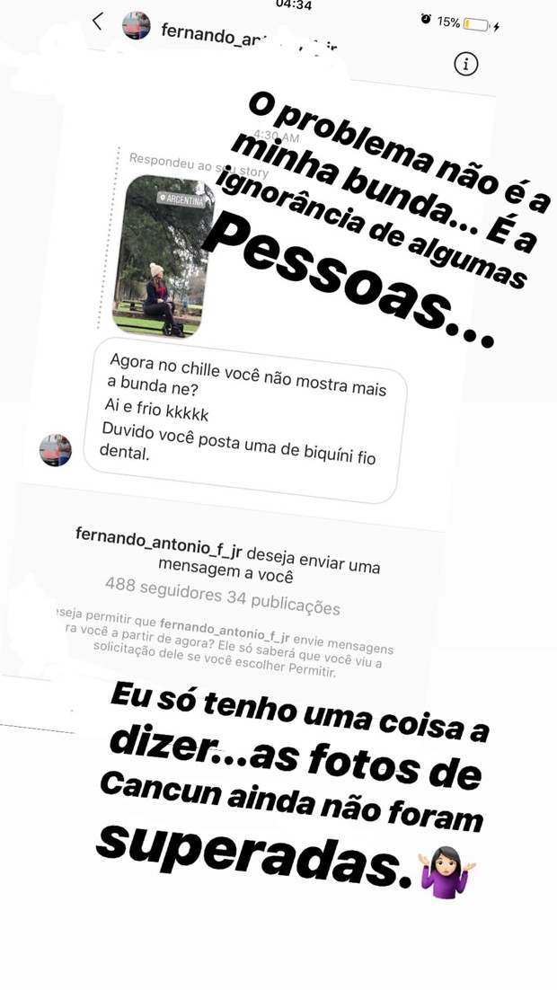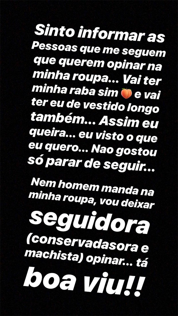 "Sinto informar as pessoas que me seguem que querem opinar em minha roupa... Vai ter minha raba sim, e vai ter eu de vestido longo também... Assim eu queira... Eu visto o que eu quero, não gostou é só parar de seguir", começou ela.