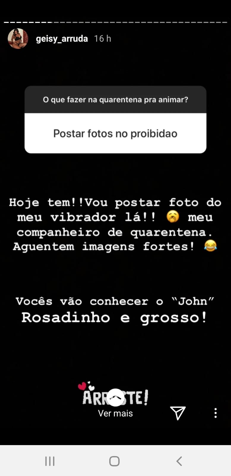 Segundo a beldade, ela tem usado o vibrador para saciar os desejos. "Hoje tem! Vou postar foto do meu vibrador, meu companheiro de quarentena."
