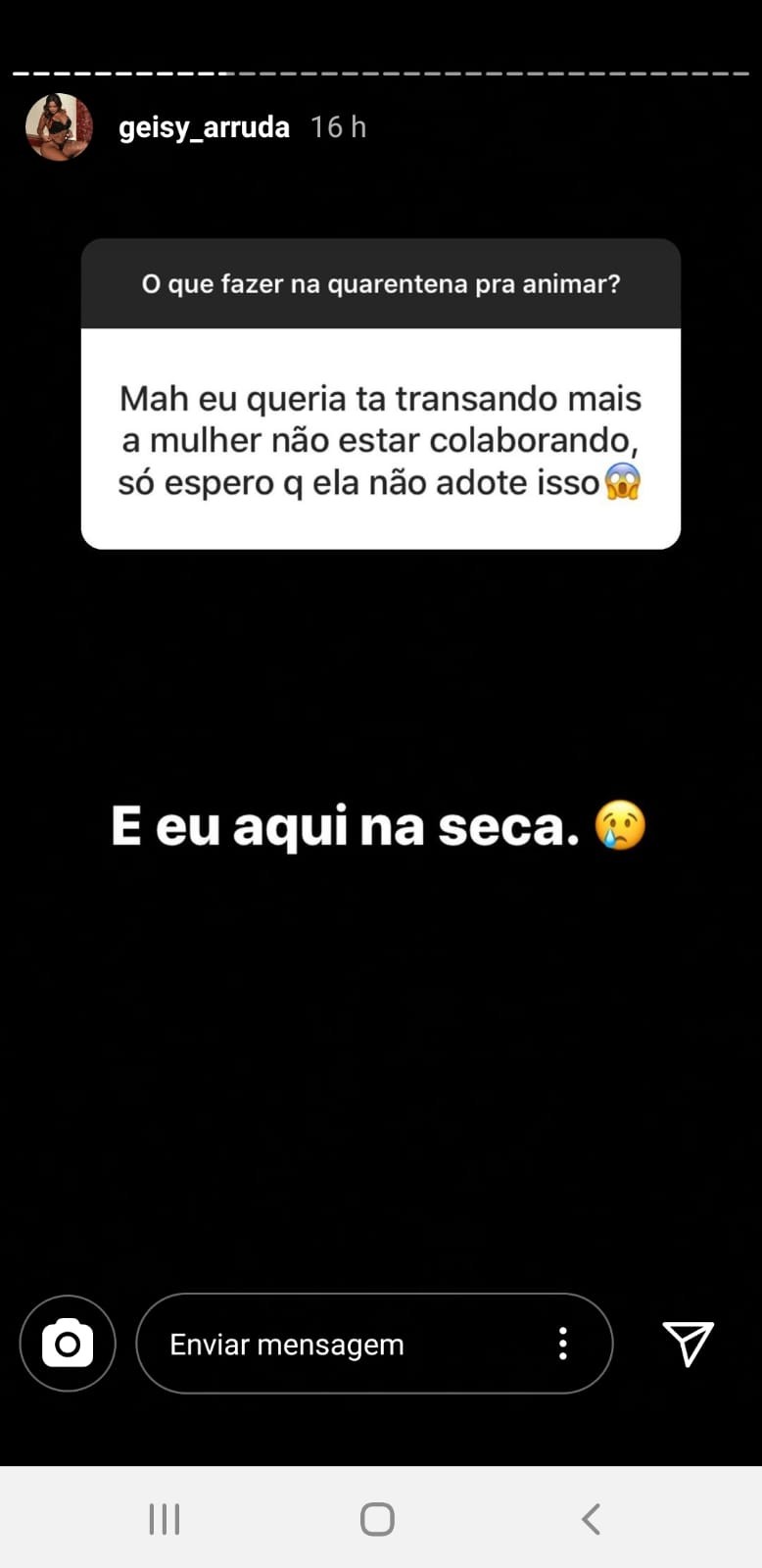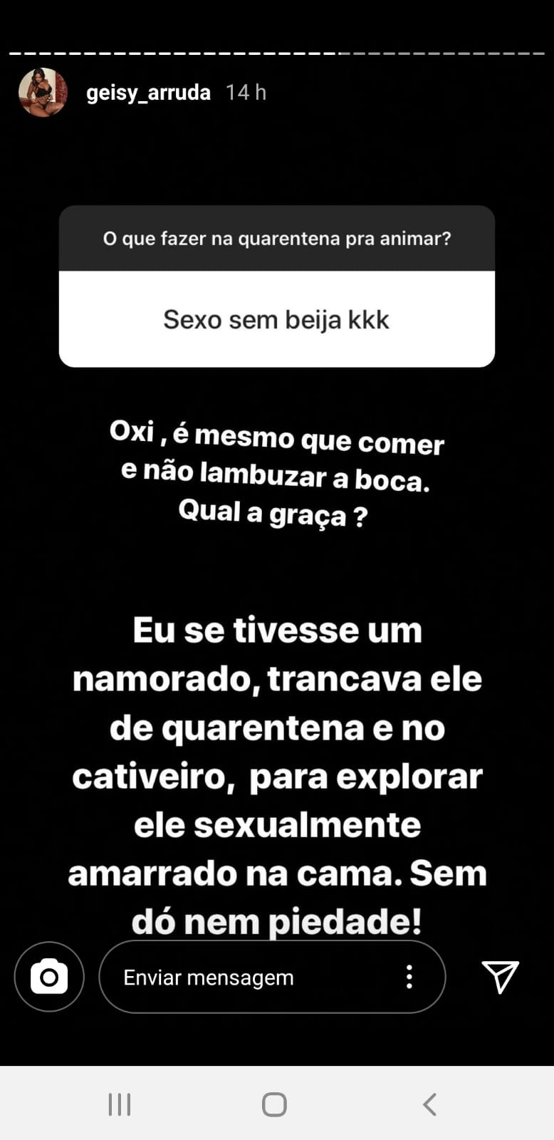 "Se eu tivesse namorado, trancava ele de quarentena e no cativeiro para explorar ele sexualmente amarrado na cama. Sem dó, nem piedade", disse ela, que ainda desabafou: "Eu aqui na seca".