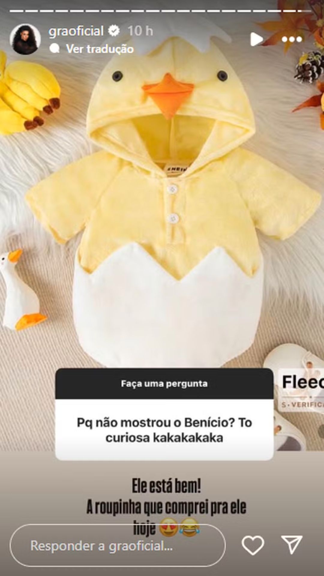 Ela, que recentemente falou sobre o desejo de reatar com Belo, também respondeu a uma pergunta sobre Benício, seu bebê reborn. "Por que não mostrou [mais ele]? Estou curiosa", escreveu um internauta. Gracy então respondeu: "Ele está bem! [Olha] a roupinha que comprei pra ele hoje (risos)". O item comprado foi um macacão com estampa que imita um pintinho saindo do ovo.