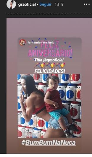 Dentre várias postagens, uma delas se destacou. No clique, a morena apareceu segurando um garotinho em seu bumbum musculoso e avantajado. "Bumbum na nuca", escreveu a pessoa que tirou a foto que deu o que falar na web.