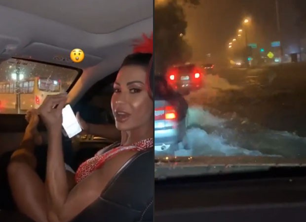 Horas antes, a morena mostrou sua insistência para ir ao compromisso. Mesmo com sem energia em sua casa, ela se arrumou com hairstylist Cinthia Silva. "A gente está se arrumando e acaba a luz. Está chovendo real, acabou aluz e está alagado lá fora. A Cinthia agora vai testar os dons dela. Alô, União da Ilha, me espera. O cabelo está intacto. Pode cair toda a chuva que o cabelo não cai. Mas isso dói", disse ela ao se preparar.