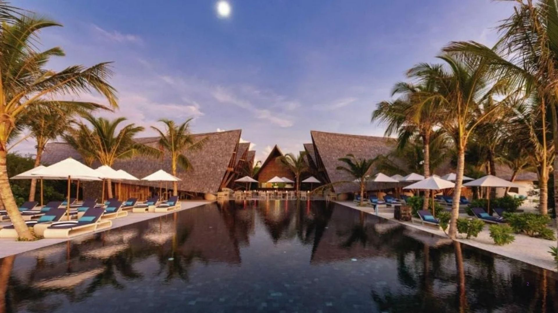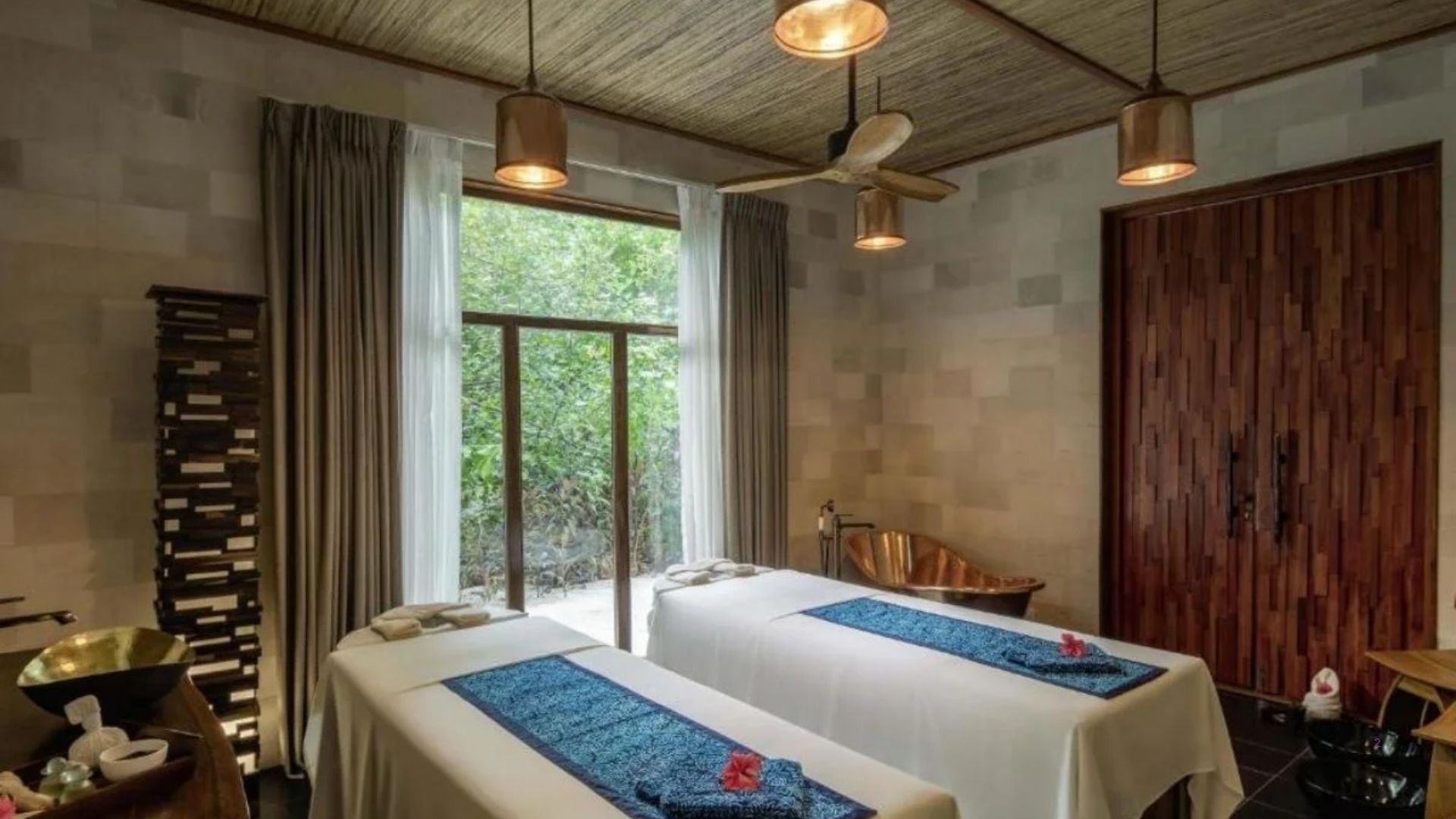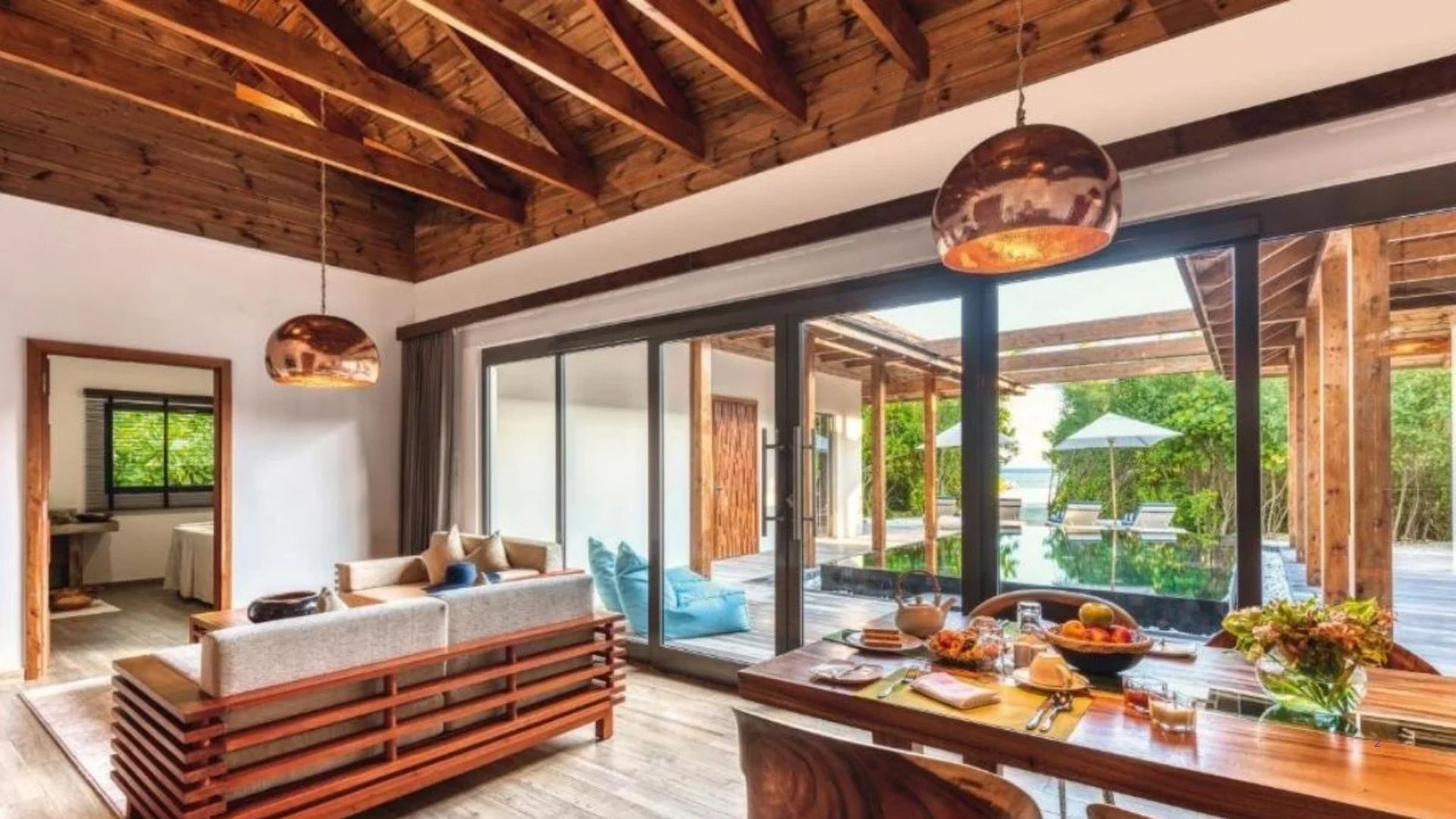 A acomodação conta com 230 m², incluindo sala de estar, quatro quartos separados e três banheiros com banheira. O espaço ainda oferece piscina privativa, jardim, banheira de hidromassagem e varanda térrea, compondo a área reservada utilizada pelo casal durante a estadia no destino paradisíaco.