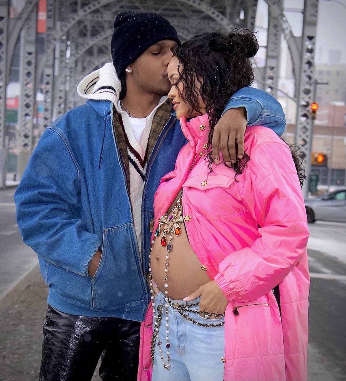 Rihanna, 33, está esperando seu primeiro filho com o rapper A$AP Rocky. O casal foi fotografado em Nova York no fim de semana, onde Rihanna estreou sua barriguinha enquanto usava uma longa jaqueta rosa.