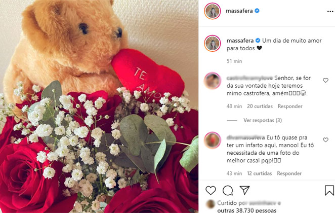 Grazi Massafera exibiu como foi parte do seu dia dos namorados. A atriz, que namora Caio Castro, ganhou um presente pra lá de romântico: rosas vermelhas com um ursinho de pelúcia.