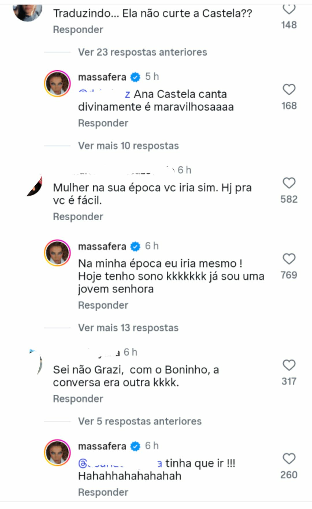Em comentários feitos em uma publicação da página Segue a Cami, Grazi Massafera respondeu a internautas e esclareceu que sua fala não era uma crítica à cantora. “Ana Castela canta divinamente, é maravilhosa”, publicou.
