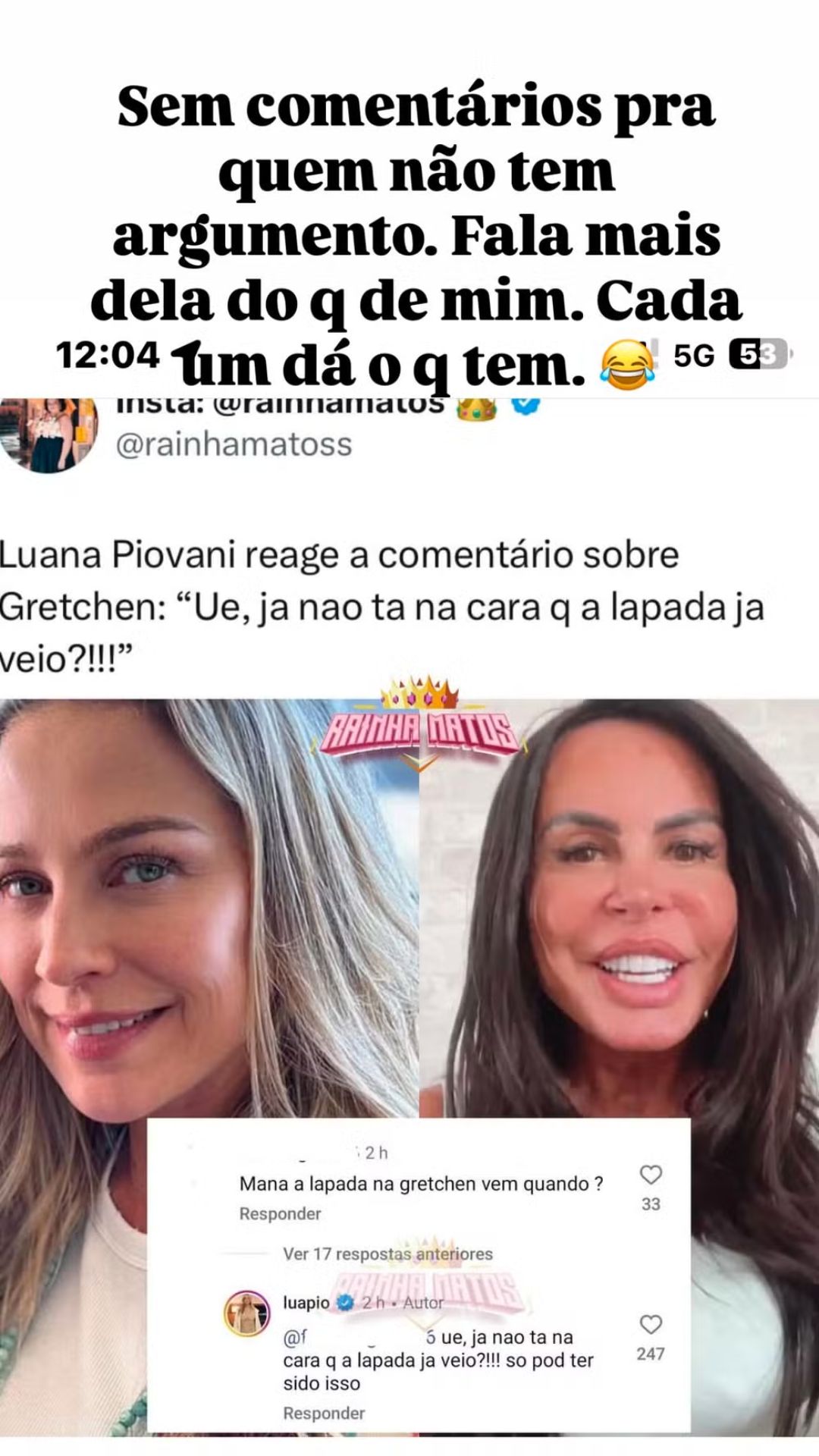 Gretchen comentou sobre as recentes falas de Luana Piovani, após ter sido mencionada pela atriz em tom irônico nas redes sociais. A cantora resolveu se pronunciar depois que seguidores pediram uma resposta à provocação. "Ué, já não está na cara que a lapada já veio?! Só pode ter sido isso", disse Piovani em resposta aos internautas.