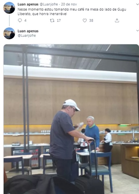 "Nesse momento estou tomando meu café na mesa do lado de Gugu Liberato, que honra inenarrável", postou Luan, que confirmou à Quem que a imagem foi tirada na área VIP do local. Luan ainda contou que não chegou a falar com Gugu. "Era por volta das 9h da manhã. Eu fiquei a cerca de 40cm dele, mas não quis incomodá-lo. Ele estava lendo umas revistas", revelou Luan, que lamentou nas redes sociais não ter ido, naquele momento, abraçar o apresentador.