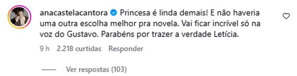 O assunto também repercutiu no Instagram. Ana Castela comentou sobre o tema e elogiou o ex-namorado: “Princesa é linda demais! E não haveria uma outra escolha melhor pra novela. Vai ficar incrível só na voz do Gustavo”, escreveu a cantora, encerrando as especulações sobre uma possível regravação.