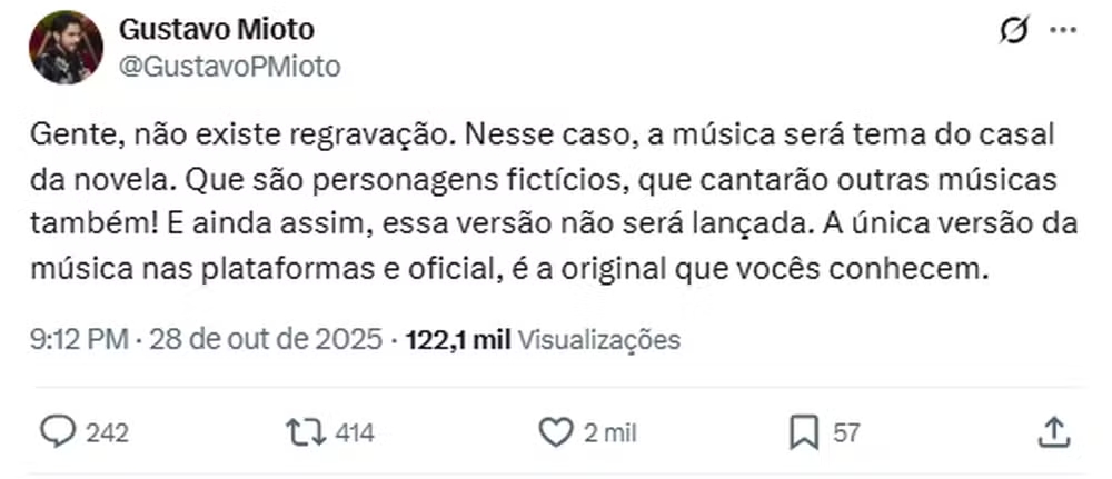 Em postagem no X, antigo Twitter, Mioto explicou que não haverá nova versão da música: “Gente, não existe regravação. Nesse caso, a música será tema do casal da novela, que são personagens fictícios e cantarão outras músicas também! E ainda assim, essa versão não será lançada. A única versão da música nas plataformas e oficial é a original que vocês conhecem.”