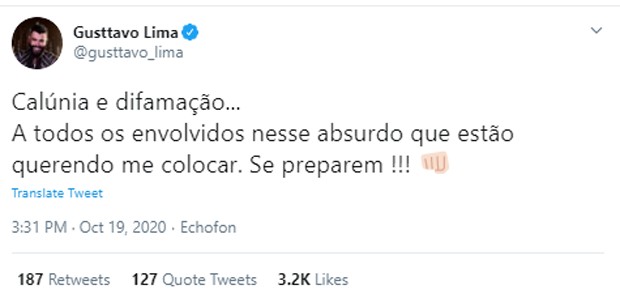 Logo após o áudio vazar, o músico postou em seu Twitter: "Calúnia e difamação... A todos os envolvidos nesse absurdo que estão querendo me colocar, se preparem!".