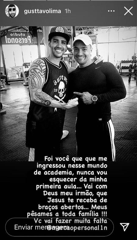 “Foi você que me ingressou nesse mundo de academia, nunca vou esquecer da minha primeira aula… Vai com Deus, meu irmão! Que Jesus te receba de braços abertos. Meus pêsames a toda a família! Você vai fazer muita falta”, legendou Gusttavo.