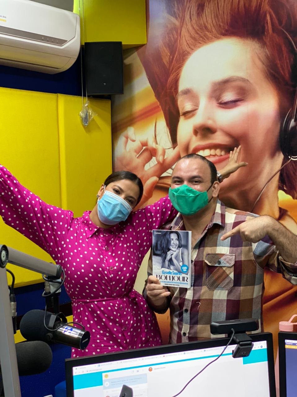Gyselle se divertiu com André Moura nos estúdios da Boa FM. Crédito: divulgação.