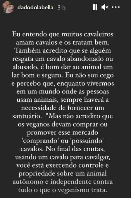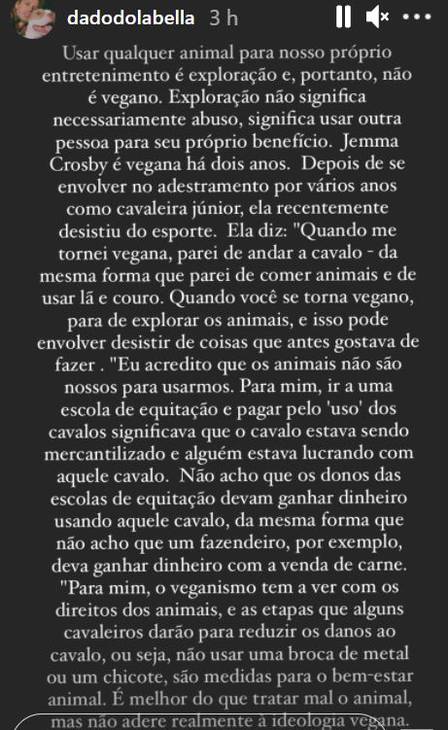 Dado Dolabella, que se diz vegano e defensor das causas animais, postou em seguida um longo texto (veja abaixo) nos stories de seu perfil no Instagram, justificando seu posicionamento. "Usar qualquer animal para nosso próprio entretenimento é exploração, e, portanto, não vegano".