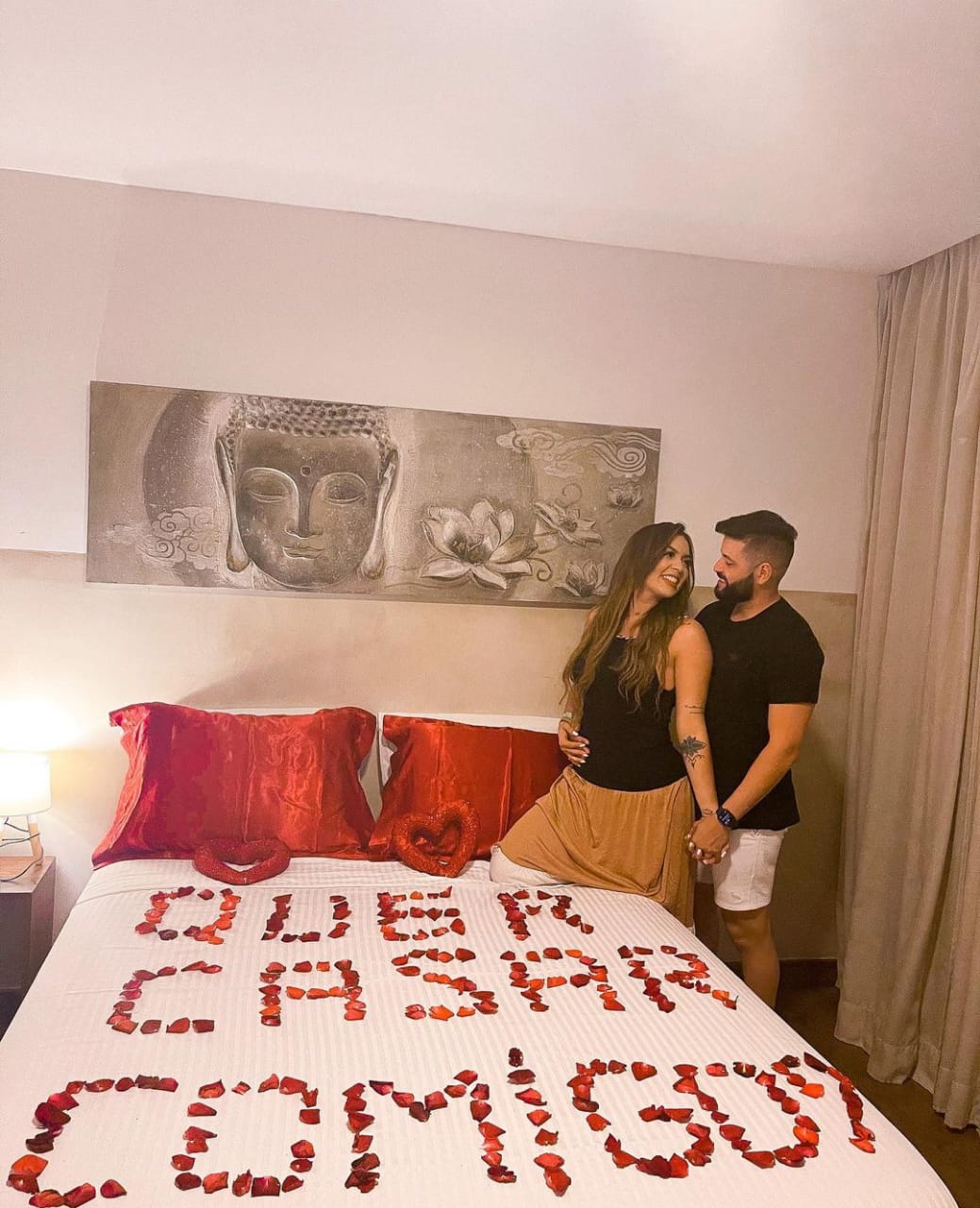 O pedido aconteceu no hotel, com muito romantismo, com uma frase de pétalas na cama.